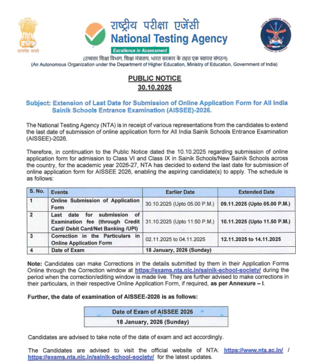 अगर आप सोच रहे हैं कि AISSEE 2026 के लिए आवेदन की आखिरी तारीख क्या है, तो जवाब है – अब आपके पास थोड़ा और समय है! राष्ट्रीय परीक्षण एजेंसी (NTA) ने ऑल इंडिया सैनिक स्कूल्स प्रवेश परीक्षा (AISSEE) 2026 के लिए आवेदन की अंतिम तिथि बढ़ा दी है। अब उम्मीदवार 9 नवंबर 2025 तक आवेदन कर सकते हैं। साथ ही, Correction Window 12 से 14 नवंबर 2025 तक खुली रहेगी। उम्मीदवार कक्षा 6 और कक्षा 9 में प्रवेश के लिए आधिकारिक वेबसाइट exams.nta.nic.in/sainik-school-society पर ऑनलाइन पंजीकरण कर सकते हैं। गौरतलब है कि इस वर्ष NTA ने AISSEE 2026 के लिए तीन नए सैनिक स्कूलों को भी शामिल किया है।