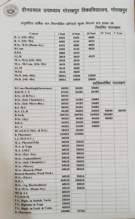 डी.डी.यू. गोरखपुर विश्वविद्यालय ने सत्र 2025-26 के लिए नियमित और स्ववित्तपोषित कोर्सों की नई फीस संरचना जारी कर दी है। इस बार कुछ कोर्सों की फीस में हल्का इजाफा किया गया है, जबकि कई कोर्स पहले की तरह ही रखे गए हैं।