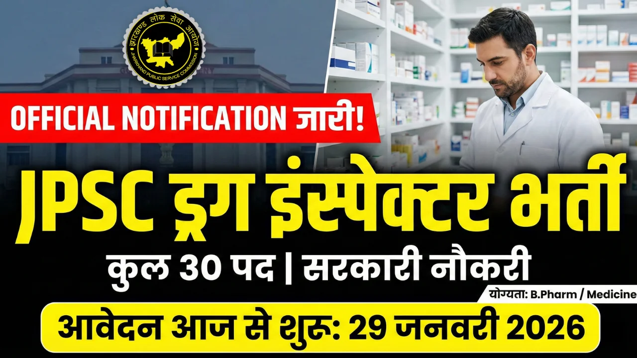 झारखंड लोक सेवा आयोग (JPSC) ने राज्य के स्वास्थ्य विभाग में ड्रग इंस्पेक्टर (औषधि निरीक्षक) के रिक्त पदों को भरने के लिए आधिकारिक अधिसूचना (Advt No. 12/2025) जारी कर दी है। फार्मेसी और चिकित्सा क्षेत्र में अपना करियर बनाने की इच्छा रखने वाले युवाओं के लिए यह एक सुनहरा अवसर है।