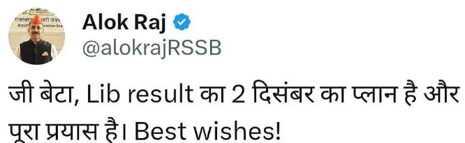राजस्थान कर्मचारी चयन बोर्ड (RSSB) के अध्यक्ष आलोक राज ने सोशल मीडिया पर जानकारी साझा करते हुए बताया है कि लाइब्रेरियन ग्रेड 3 परीक्षा का परिणाम 2 दिसंबर 2025 को प्रकाशित किया जाएगा। जिन उम्मीदवारों ने परीक्षा दी थी, वे आधिकारिक वेबसाइट rssb.rajasthan.gov.in पर जाकर अपना रिजल्ट और श्रेणीवार कट ऑफ देख सकेंगे।