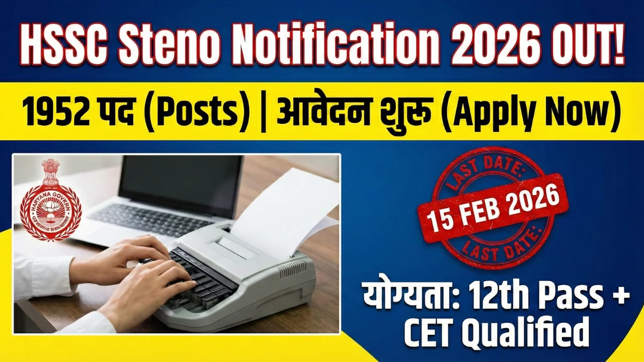 हरियाणा में सरकारी नौकरी की तैयारी कर रहे युवाओं के लिए HSSC (Haryana Staff Selection Commission) ने वर्ष 2026 का बड़ा धमाका कर दिया है। आयोग ने स्टेनोग्राफर (Stenographer) और स्टेनो-टाइपिस्ट के 1,952 पदों पर भर्ती के लिए विस्तृत अधिसूचना (Advt No 03/2026) जारी की है।