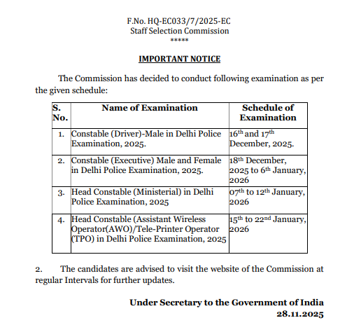 | दिल्ली पुलिस हेड कॉन्स्टेबल (मिनिस्ट्रियल) भर्ती 2025 | 07–12 जनवरी 2026 |