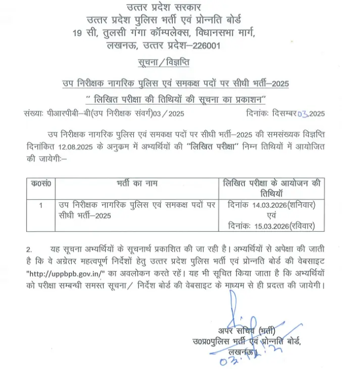 UPPRPB द्वारा जारी नोटिस 3 दिसंबर 2025 को वेबसाइट uppbpb.gov.in पर अपलोड किया गया। इसके बाद से उम्मीदवार अब अपनी तैयारी को अंतिम रूप दे रहे हैं, क्योंकि परीक्षा की डेट अब तय हो चुकी है।