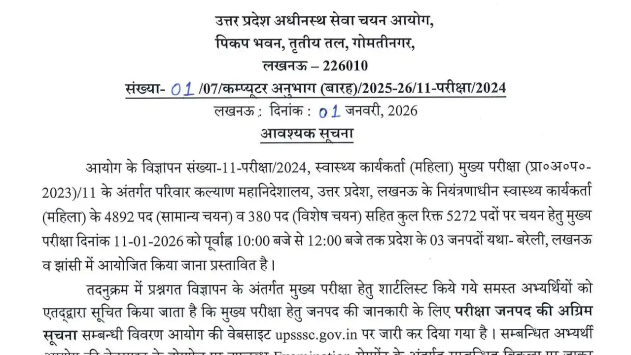 उत्तर प्रदेश अधीनस्थ सेवा चयन आयोग (UPSSSC) द्वारा जारी नोटिस के अनुसार, स्वास्थ्य कार्यकर्ता मुख्य परीक्षा 11 जनवरी 2026 को आयोजित की जाएगी।